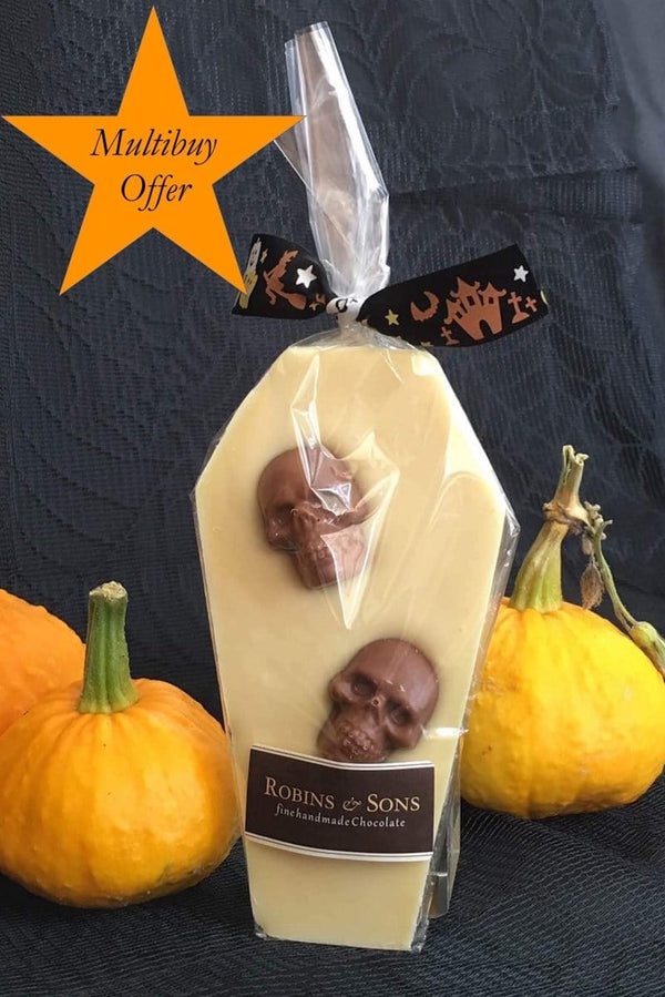Halloween fun with our coffin shaped, slender bar of yummy Belgian white chocolate, complete with 2 solid milk chocolate 'skulls', finished with a decorative ribbon.