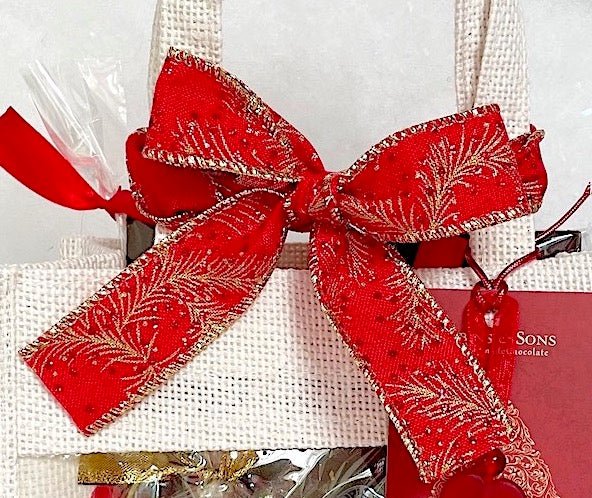 Sturdy, reusable jute gift bag that is packed full of our bestselling, delicious and decadent Belgian 70% dark chocolate treats. In addition to the goodies inside, the gift bag has a ruby red tissue inlay and is finished with a silky red ribbon, a 'Seasons Greetings' gift tag, and an enchanting heart charm.