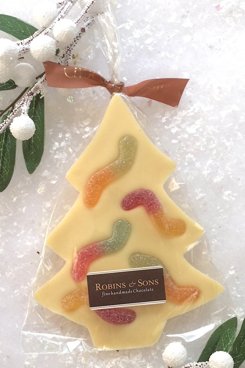 Delicious, and fun, this seasonally shaped slender slab of yummy Belgian white chocolate, is decorated with gummy 'Fizzy Wizzers' - fruit flavoured, wiggly shaped jelly sweets coated in a sour sherbet / sugar!