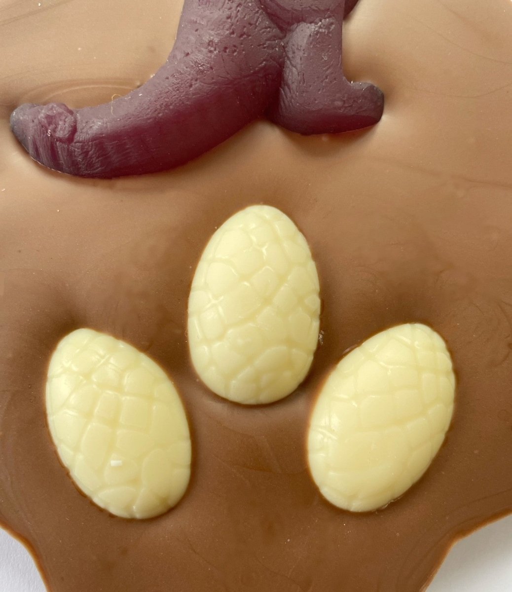 Delicious, and fun, this egg shaped slender slab of yummy milk chocolate, is decorated with a large, fruit flavoured, gummy dinosaur (assorted colours) and 3 solid white chocolate 'Prehistoric Dinosaur eggs'!